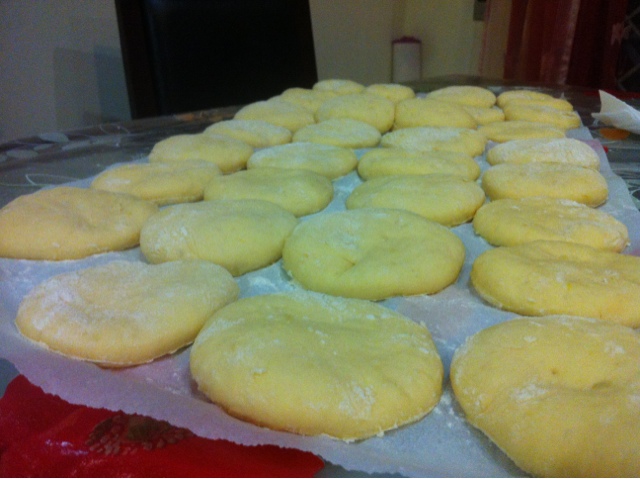 Con lo schiacciapatate far diventare le patate lesse una purea. Sciogliere il burro in un pentolino e il lievito di birra nel latte tiepido. In una ciotola capiente sbattere le uova con lo zucchero, aggiungere mescolando poi, il burro fuso, il latte con il lievito, la buccia grattugiata del limone e le patate lesse. A questo punto versare poco a poco la farina mescolando e lavorando con le mani fino ad ottenere una pasta liscia e morbida. Stendere sulla spianatoia una sfoglia di pasta alta 3 cm circa e tagliare le bombe con un tagliapasta rotondo. Lasciarle lievitare per circa un’ora e mezza.